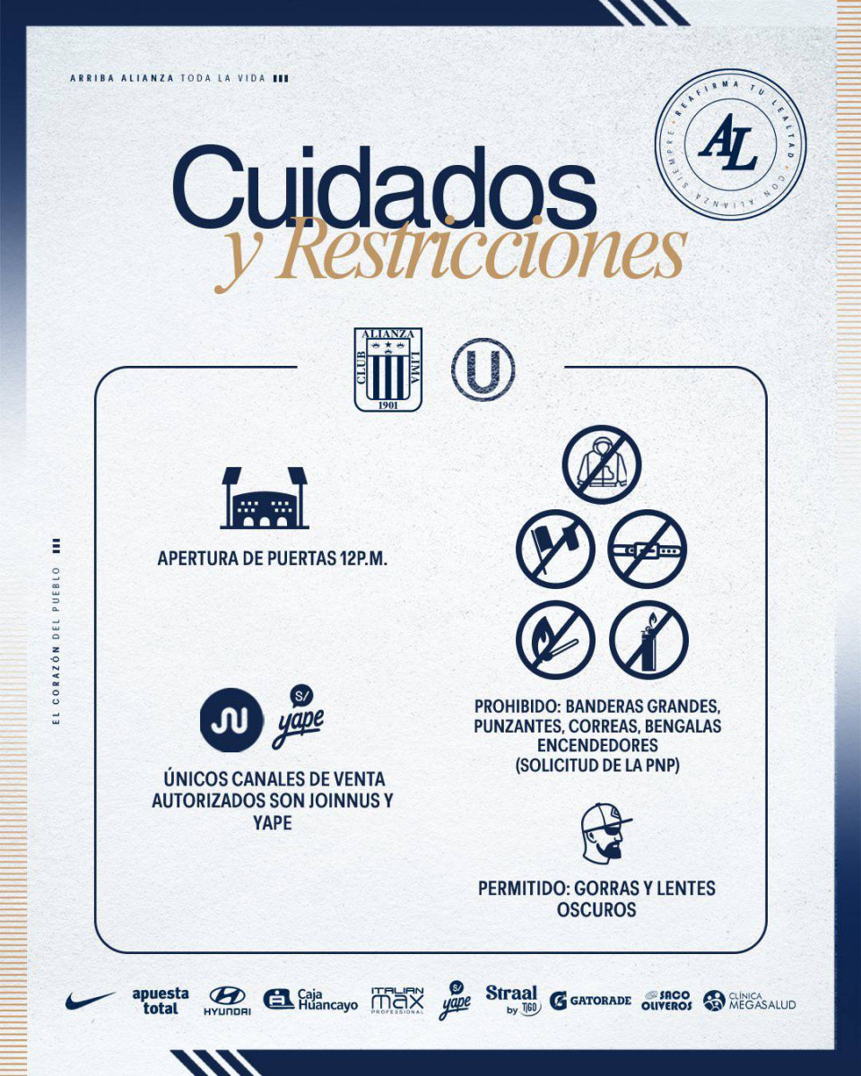 A través de sus redes sociales, Alianza Lima confirmó las medidas a tener en cuenta para el partido en el estadio Alejandro Villanueva.