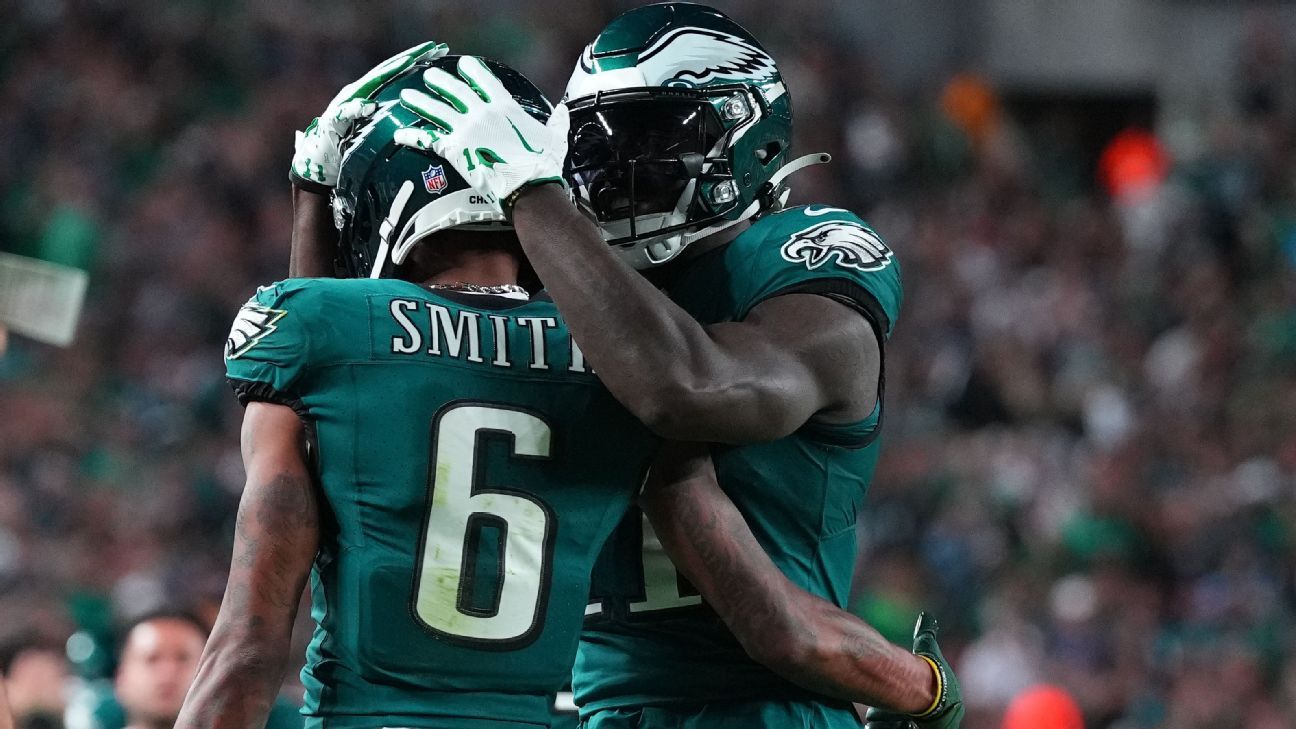 They've accounted for 79% of their team's receiving yards through two games this year, the highest in the NFL. And it has even been symmetrical: Brown and Smith each have 15 targets, they each have 11 receptions, and quarterback Jalen Hurts' average target distance to them is exactly the same (14.3 yards), according to ESPN Stats & Information.