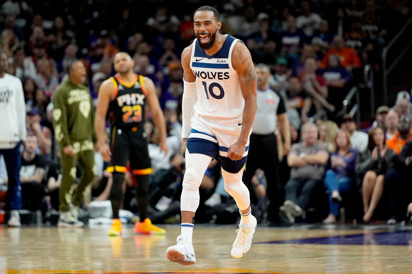 The Wolves opened the game 1-for-6 but then hit their next five shots to open up a 17-8 lead and force a Phoenix timeout. Karl-Anthony Towns finished with 10 first-quarter points but he sat the last few minutes of the quarter with two fouls. He joined Mike Conley, Naz Reid and Rudy Gobert, who each picked up a pair of fouls.