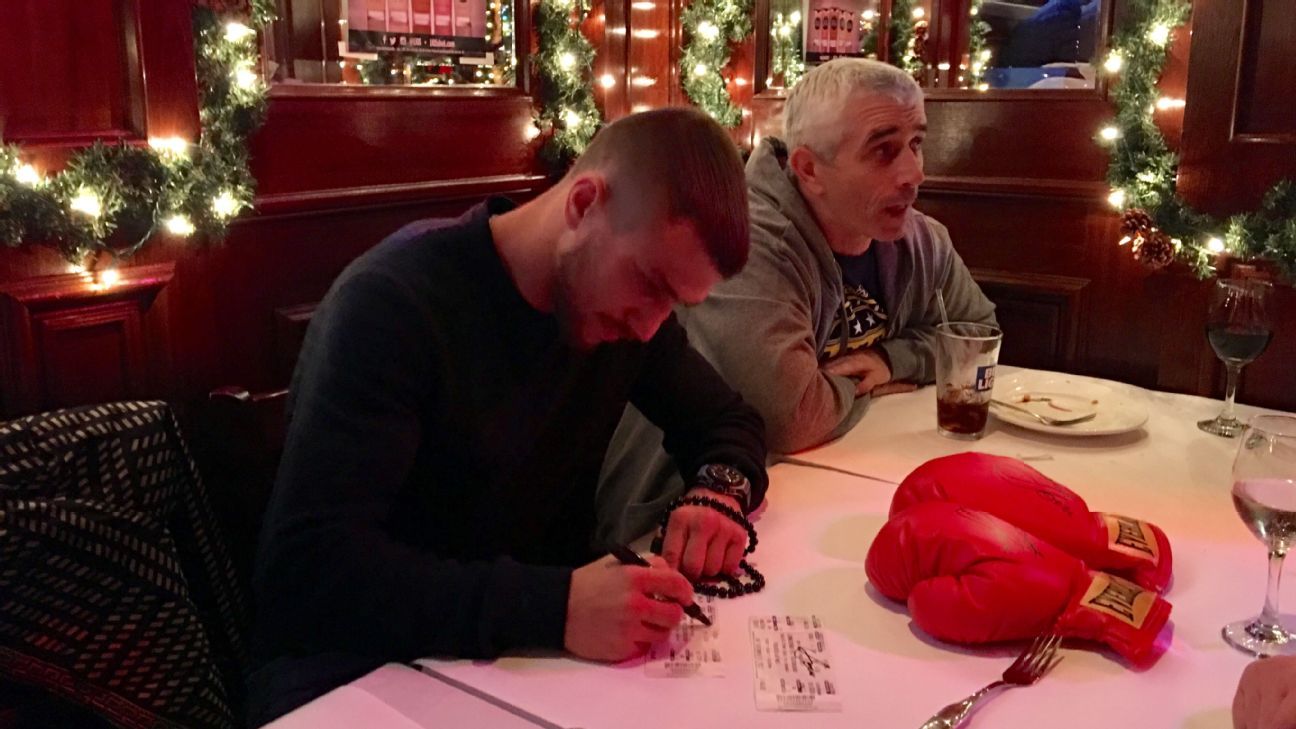 NUEVA YORK -- Son las 2 a.m. y Vasiliy Lomachenko está sentado en una mesa de la esquina en el segundo piso de Jack Doyle's, un popular pub irlandés a dos cuadras al norte de Madison Square Garden. Su padre y entrenador, Anatoly, está sentado a su izquierda, y su manager, Egis Klimas, está sentado frente a él. Cuando los invitados a su fiesta posterior a la pelea le entregan boletos, bufandas y guantes para firmar, raramente se sonríe.