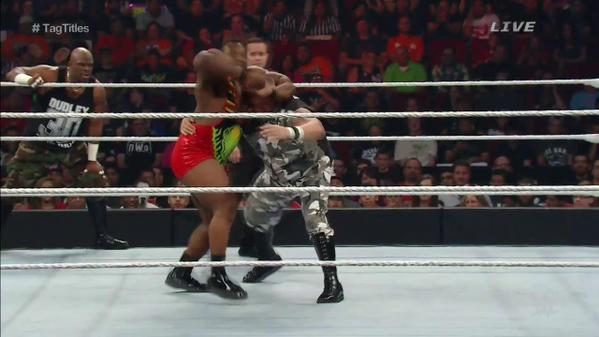 | Rodillazo en la cara para Bubba Ray. Luego Big E le aplica un planchazo. |