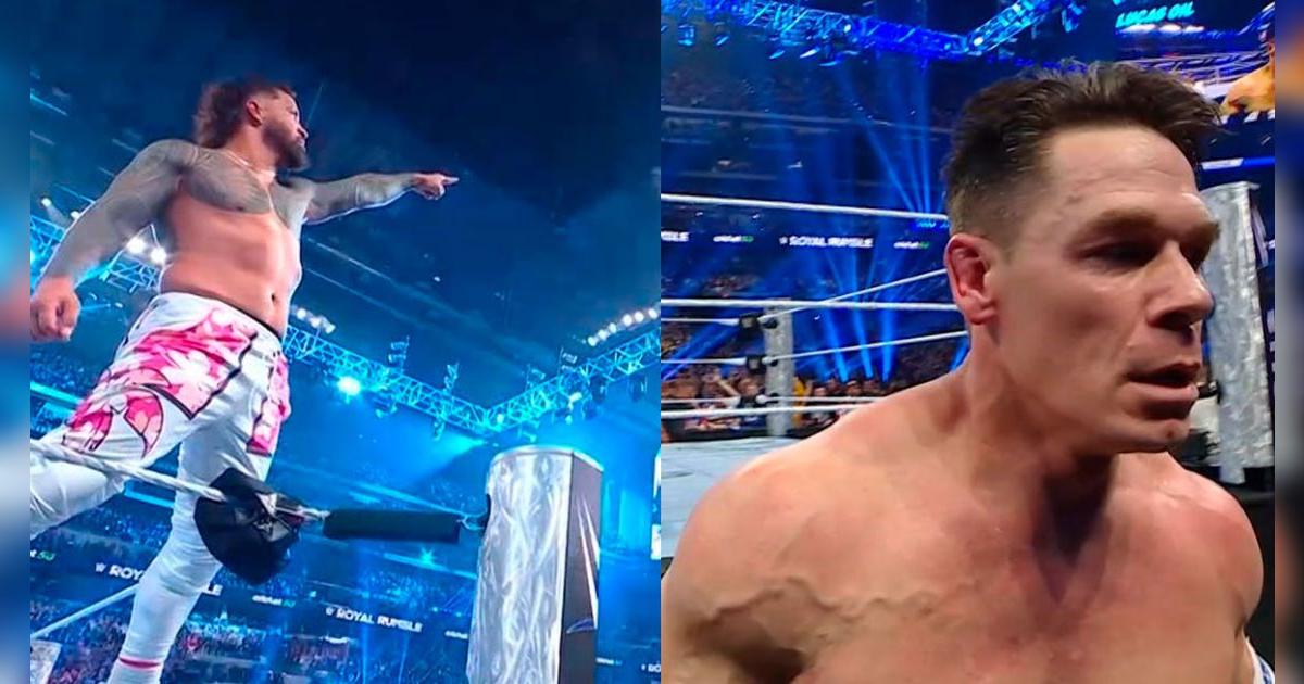 Cena y Jey Uso en el ring. Uno de ellos ganará la batalla real. ¿John logrará el título número 17 en su último Royal Rumble?