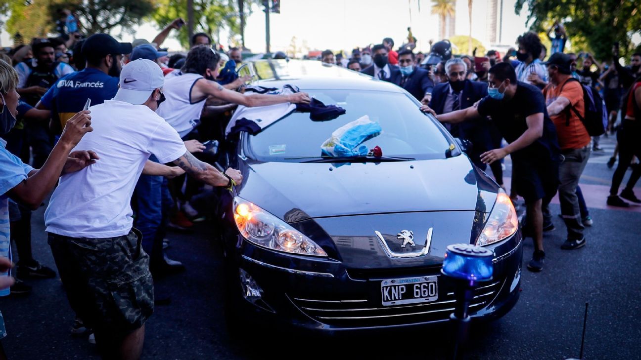 Durísima imagen en la tarde porteña, con el féretro dentro del auto y el nombre del Diez en el lateral. Una imagen que duele como un puñal en el corazón.