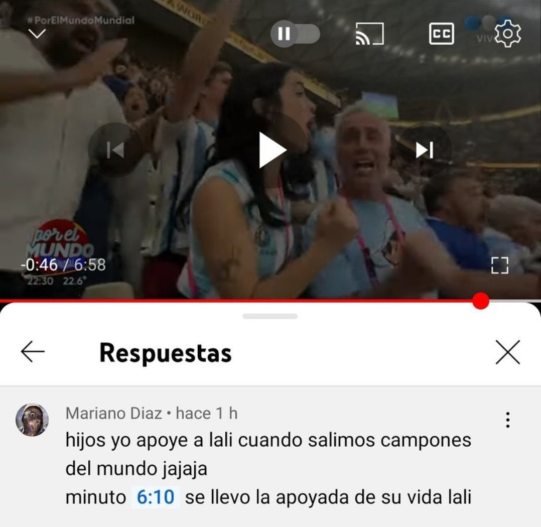 El influecer argentino Pepe Ochoa compartió una captura en Twitter donde se ve que el sujeto, que aparentemente acosó a Lali, tomó con gracia su actitud por un comentario que hizo en YouTube: "Hijos, yo apoyé a Lali cuando salimos campeones del mundo jajaja. Se llevó la apoyada de su vida".