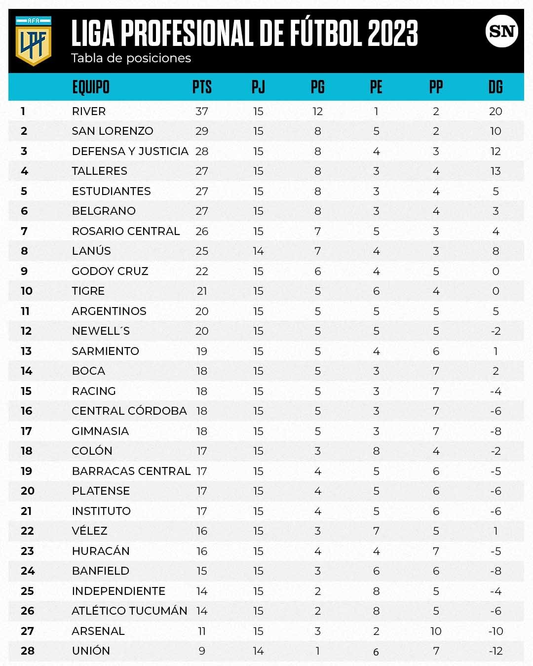 Con 37 puntos en su cuenta, River jugará el domingo, a sabiendas de lo sucedido con el escolta San Lorenzo (29), que el sábado visitará a Banfield en el sur bonaerense, mientras que Defensa y Justicia (28), tercero en liza, recibirá a Estudiantes de La Plata.