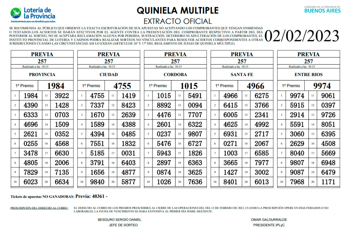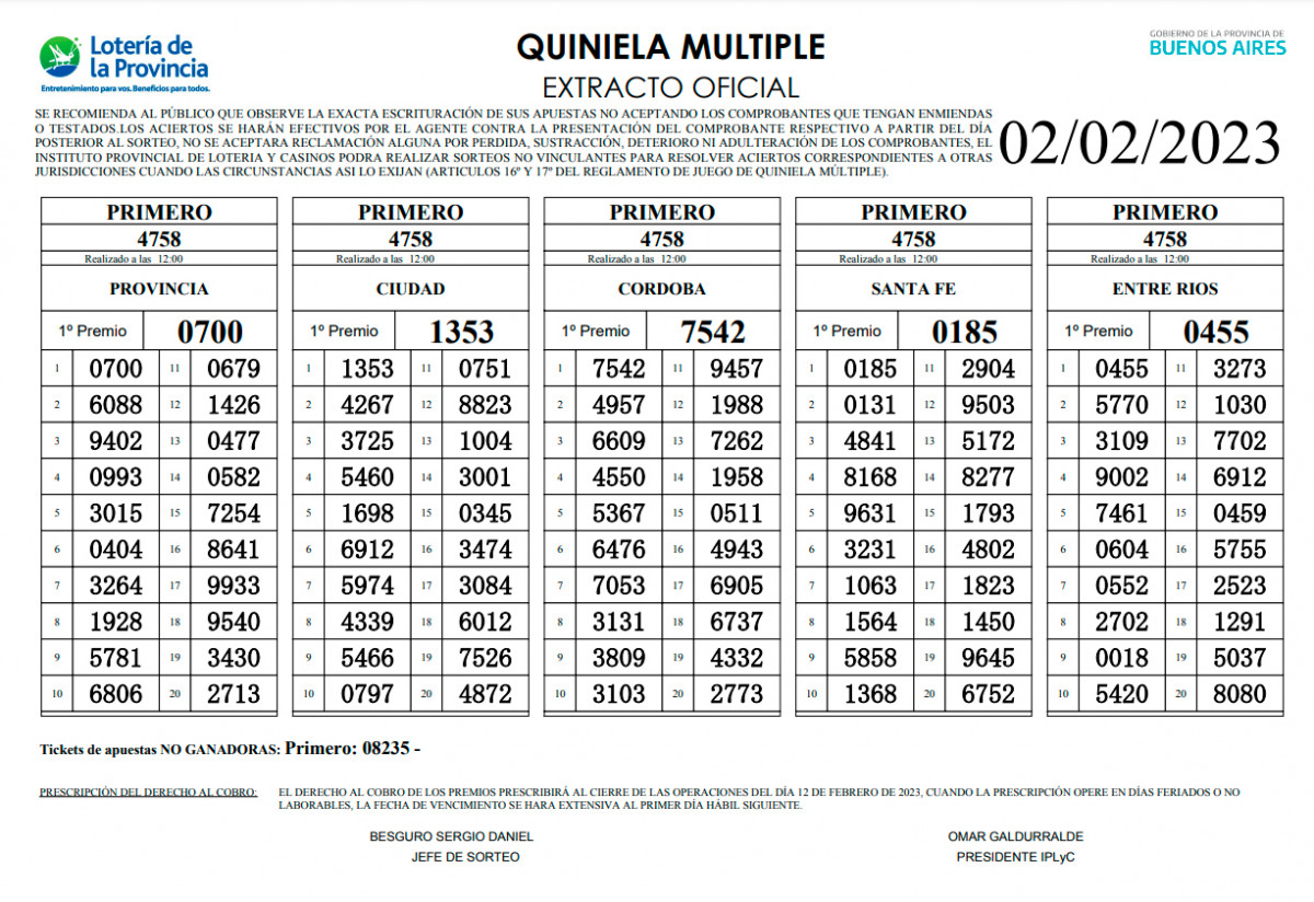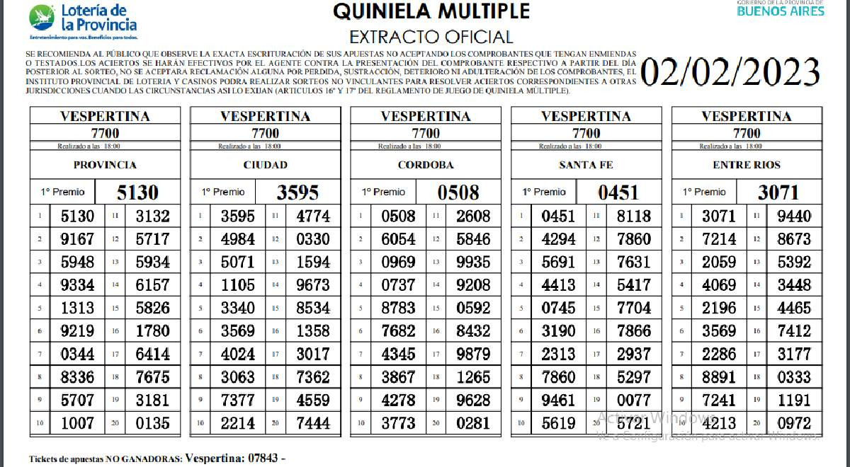 Extracto oficial de LA PRIMERA de hoy, jueves 2 de febrero