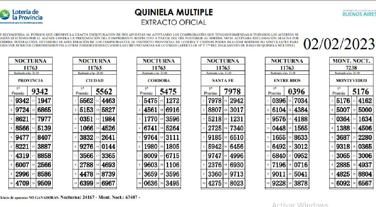 Extracto oficial de LA NOCTURNA de HOY , jueves 2 de febrero