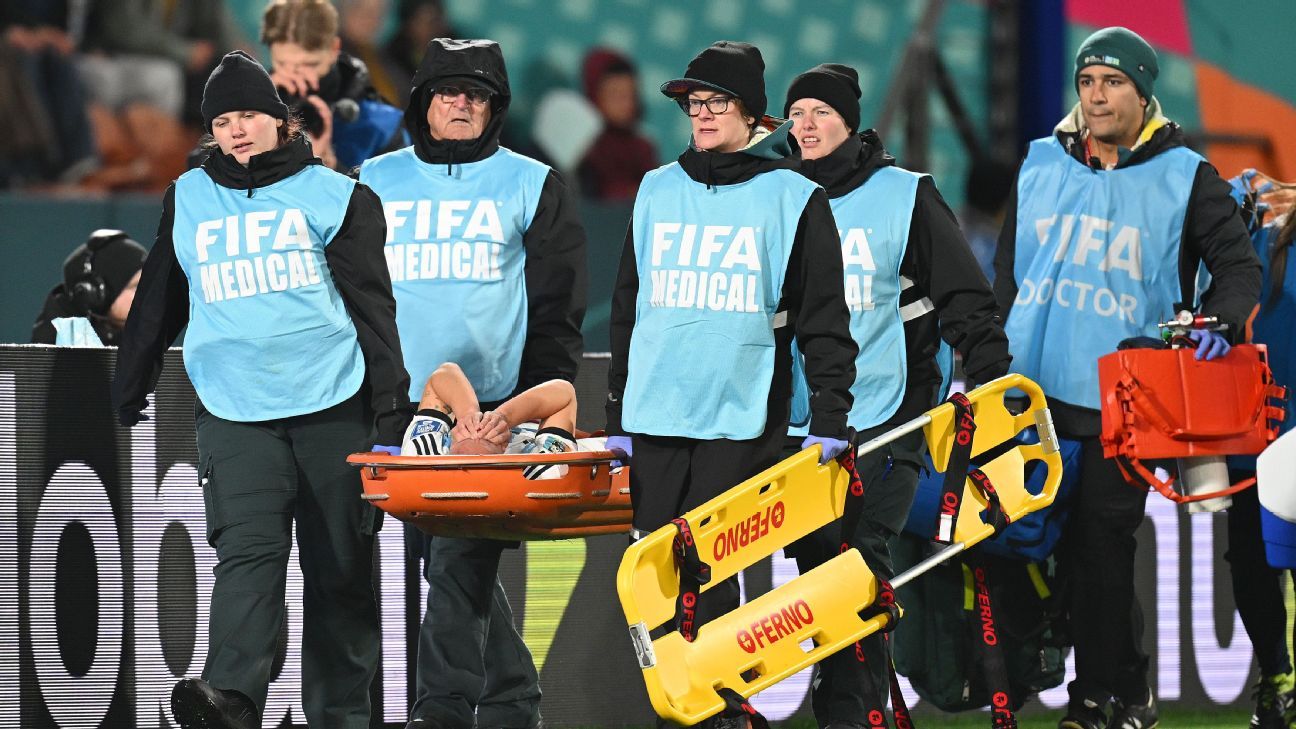 La jugadora del Madrid Club de Fútbol Femenino dejó la cancha en camilla con lágrimas en los ojos y claras muestras de dolor, luego de disputar una pelota por la izquierda con la sueca Hanna Bennison y quedar tirada en el césped.