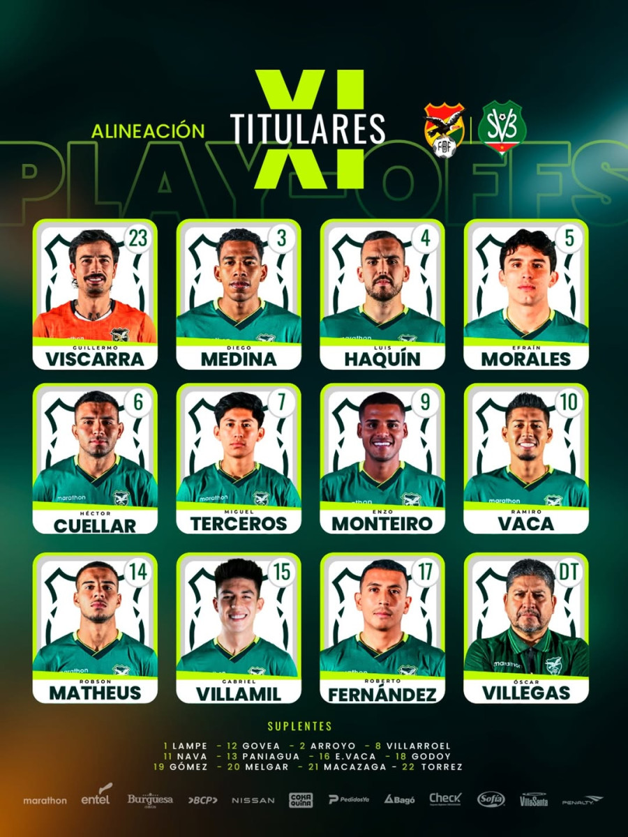 Guillermo Viscarra; Diego Medina, Marcelo Torres, Diego Arroyo, Roberto Fernández; Gabriel Villamil, Moisés Villarroel, Héctor Cuéllar; Miguelito Terceros, Fernando Nava y Enzo Monteiro.