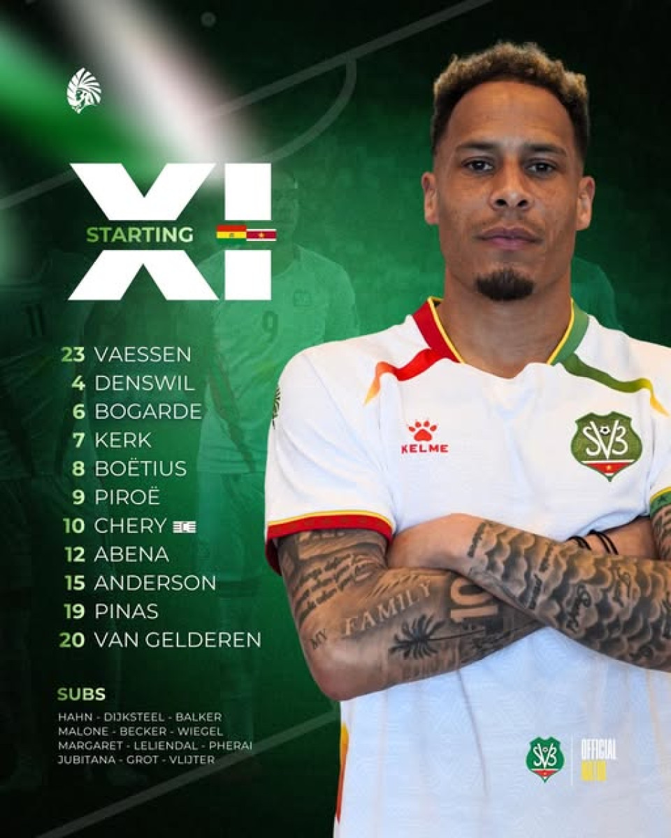 Alineación de Surinam: Etienne Vaessen; Shaquille Pinas, Myenty Abena, Djavan Anderson; Melayro Bogarde, Jean-Paul Boëtius, Liam Van Gelderen, Stefano Denswil; Joël Piroe, Gyrano Kerk y Tjaronn Chery.