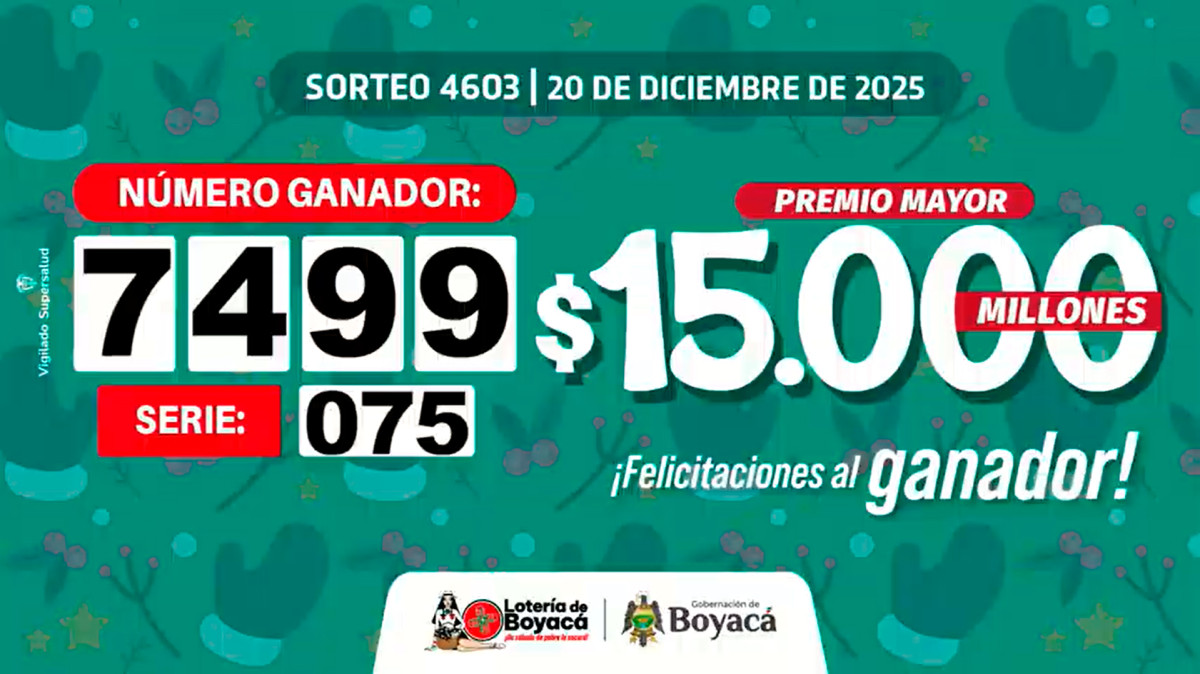 Este sábado se presentó la edición número 4603 de la Lotería de Boyacá y el sorteo ofreció un premio mayor de hasta $15 000 millones de pesos colombianos. En esta nota podrás conocer los números ganadores del sábado 20 de diciembre de 2025.