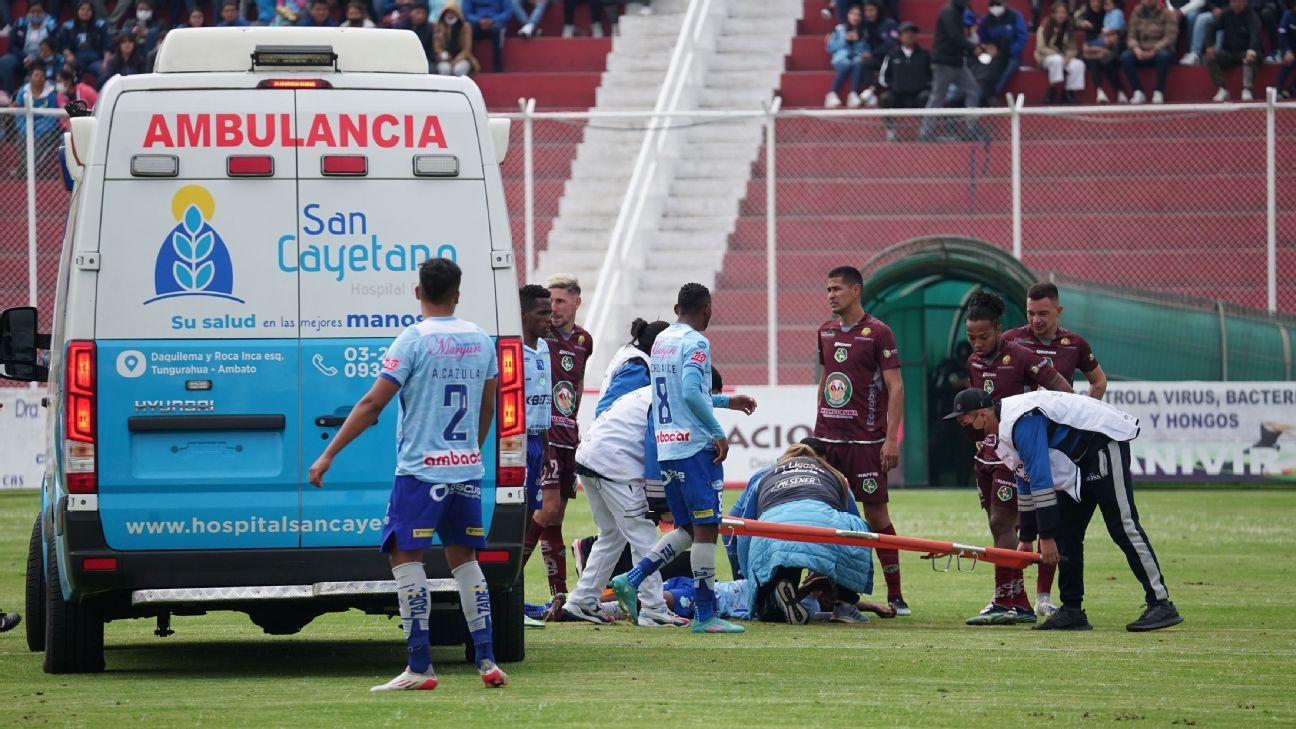 Stalin Caicedo, jugador de Macará, se recupera del golpe en la cabeza que sufrió en el partido contra Mushuc Runa. El jugador chocó en una disputa aérea y cayó sobre el césped, ante la desesperación de sus compañeros y rivales.