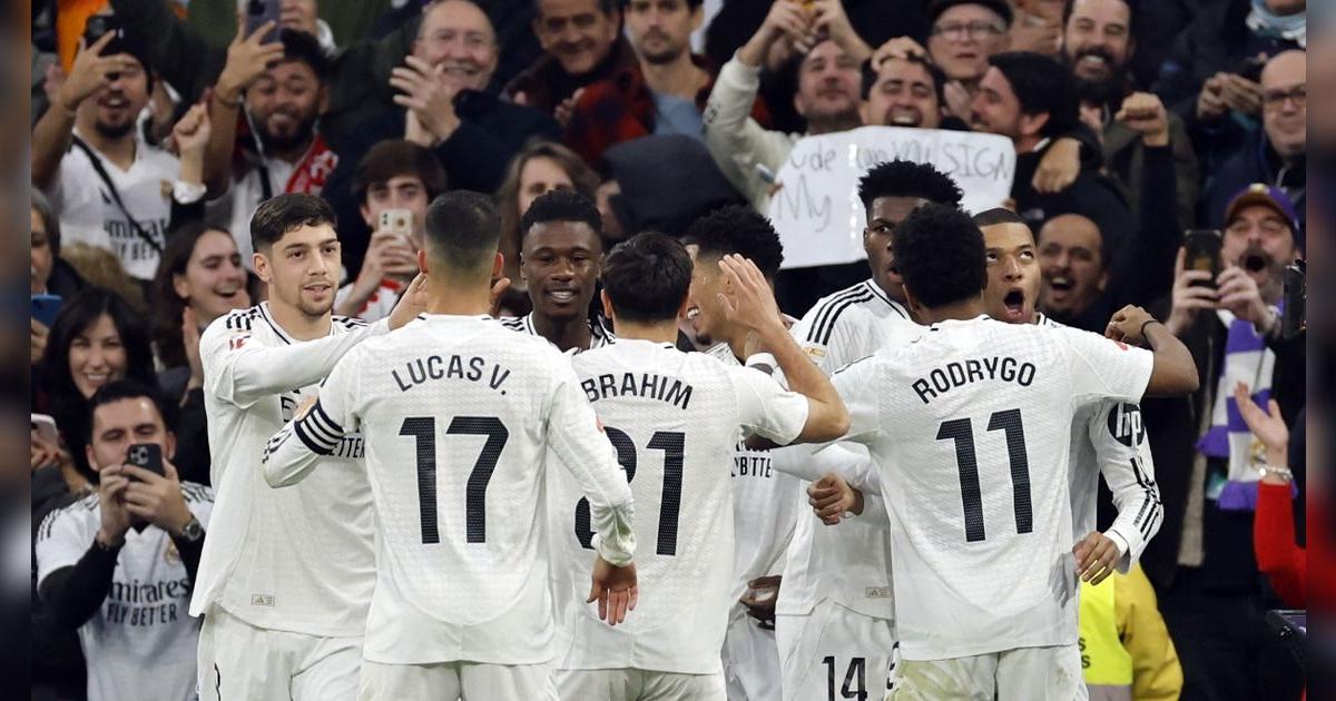 Rodrygo Goes firmó el 3-0 con una soberbia anotación. Asistencia de Lucas Vásquez y lo celebra todo el Bernabéu.