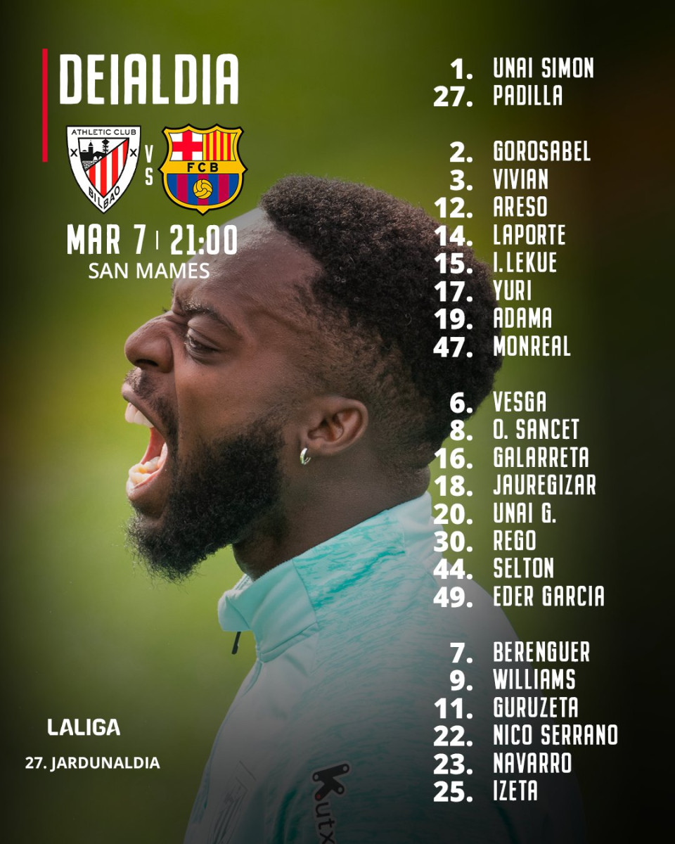 Unai Simón; Jesús Areso, Dani Vivian, Aymeric Laporte, Yuri; Alejandro Rego, Mikel Jauregizar; Iñaki Williams, Oihan Sancet, Álex Berenguer; Gorka Guruzeta.