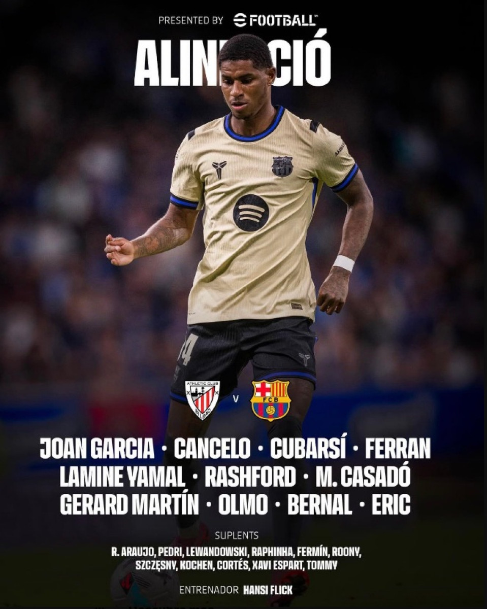 Alineación de Barcelona: Joan García; Joao Cancelo, Pau Cubarsí, Eric García, Gerard Martín; Marc Casadó, Marc Bernal, Dani Olmo; Lamine Yamal, Marcus Rashford y Ferrán Torres.