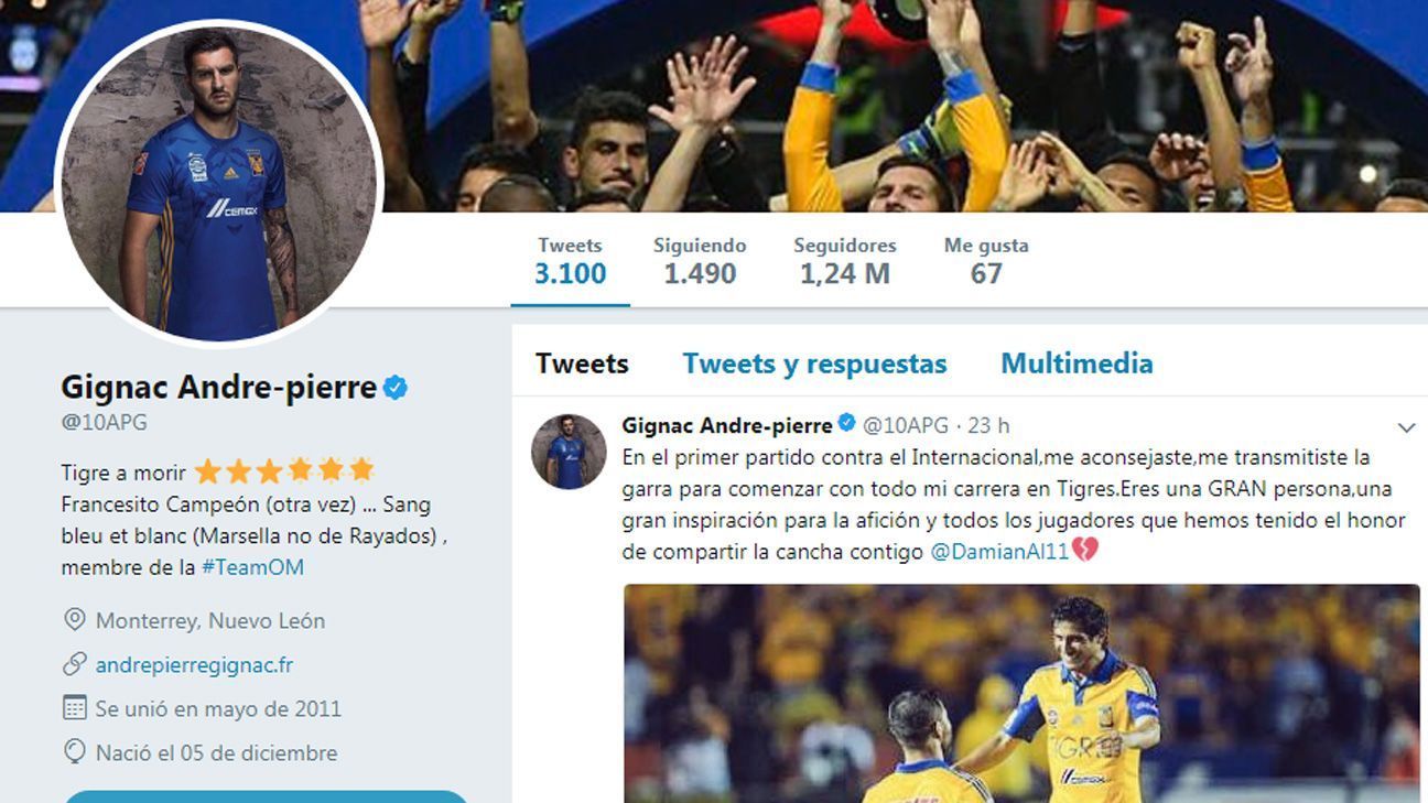 Gignac deja ver que está ‘enamorado’ de la escuadra felina al proclamarse ‘Tigre a morir’ en su cuenta oficial de la citada red social, donde enfatiza también que es de ‘sangre azul y blanca’, dejando claro que no es de Rayados, sino de Marsella.