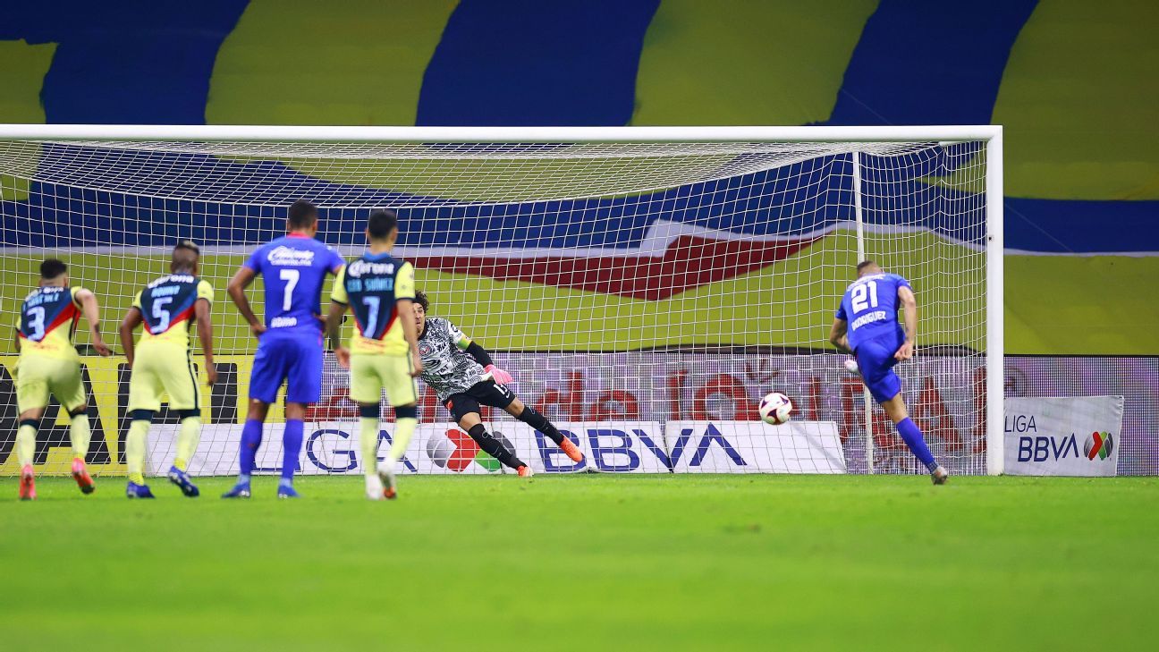 Luego de 36 minutos sin acciones en los arcos, apareció el VAR para sancionar un penal a favor del América. Álvaro Fidalgo entró al área celeste, pero fue derribado por una barrida de Roberto Alvarado. En primera instancia, Fernando Guerrero, el árbitro central, amonestó al español por fingir, pero tras revisar la jugada le quitó la amarilla y marcó la falta. Emanuel Aguilera acertó desde los once pasos para poner el 1-0.