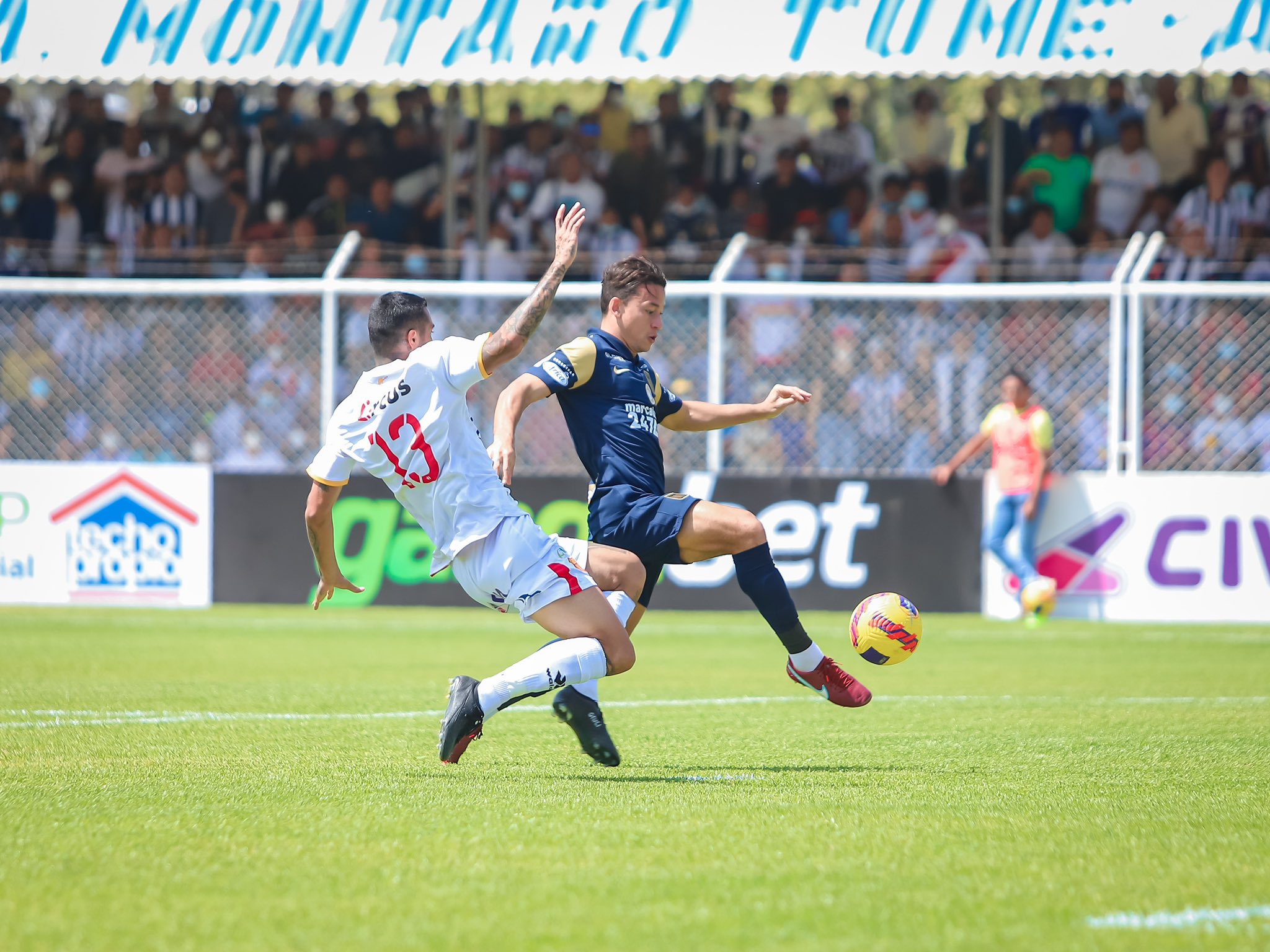 Joao Villamarín, nueva contratación del conjunto piurano, saca un remate fuera del área. Consigue un tiro de esquina a su favor.