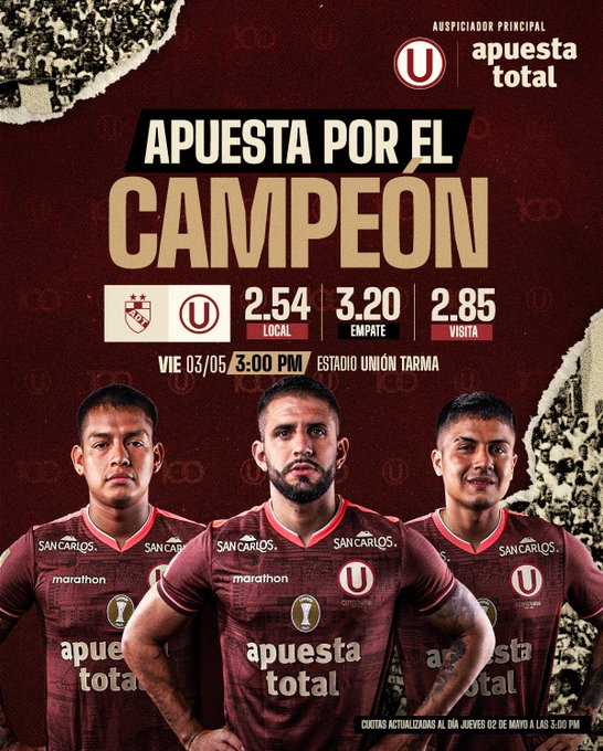 El duelo por la fecha 14 de la Liga 1 Te Apuesto entre Universitario vs. ADT se disputará este viernes 03 de mayo del 2024 en el estadio Unión de Tarma.
