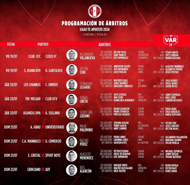 Este fin de semana se juega la fecha 2 del Torneo Clausura de la Liga 1 2024. Serán nueve partidos en todos los rincones del Perú. Universitario de Deportes, Alianza Lima, Sporting Cristal, Melgar y los demás clubes buscarán seguir luchando por los grandes objetivos que se han puesto en esta temporada y darle una alegría a su hinchada. A unos días de que inicie la segunda jornada, la Comisión Nacional de Arbitraje (CONAR) publicó la lista de árbitros que impartirán justicia en los encuentros.
