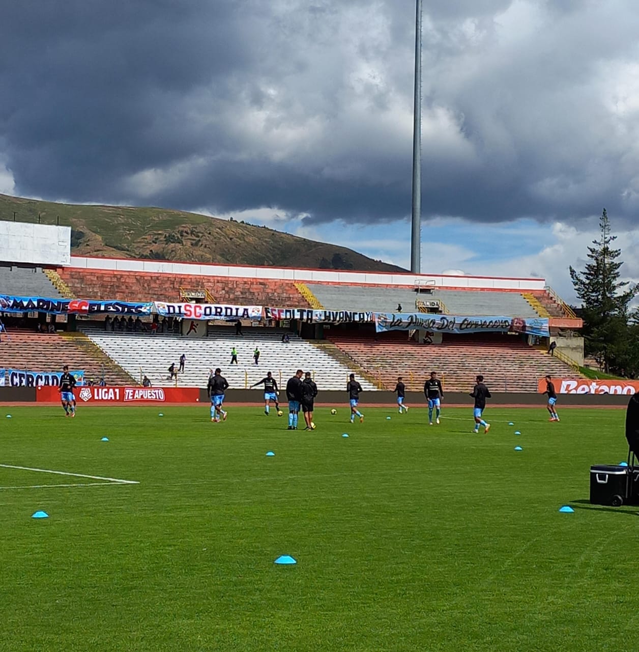 Salen los equipos al campo del estadio IPD de Huancayo.