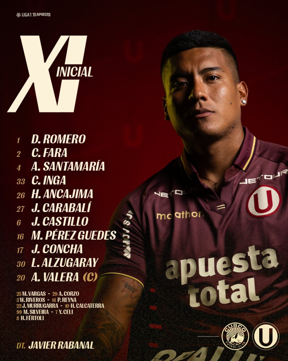 Alineación de Universitario: Diego Romero; César Inga, Caín Fara, Anderson Santamaría; Jesús Castillo, José Carabalí, Jairo Concha, Martín Pérez Guedes, Hugo Ancajima; Lisandro Alzugaray y Álex Valera.