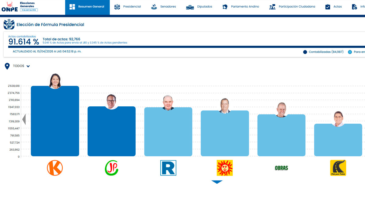 La ONPE actualizó su portal y a las 04:47:36 p. m., con 91.609 % de actas contabilizadas, Keiko Fujimori y Rafael López Aliaga lideran los votos en las Elecciones 2026.