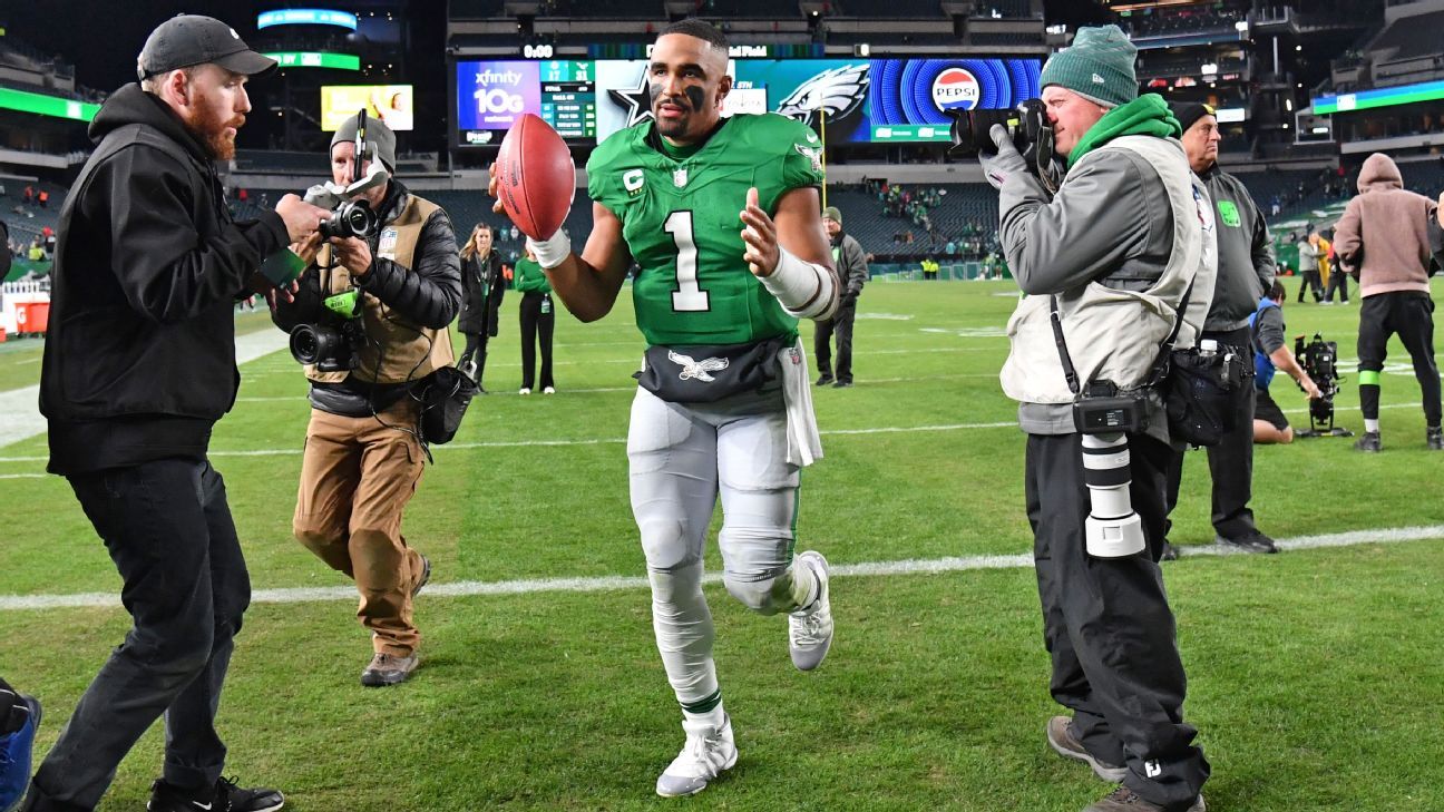 PHILADELPHIA -- Eagles quarterback Jalen Hurts played the second half of Sunday night's 31-17 win over the Miami Dolphins with a brace on his left leg.