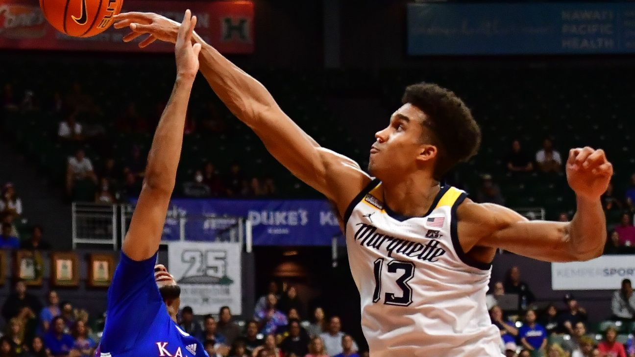 HONOLULU -- Oso Ighodaro had 21 points and nine rebounds as No. 4 Marquette routed No. 1 Kansas 73-59 on Tuesday night in the Maui Invitational semifinals.