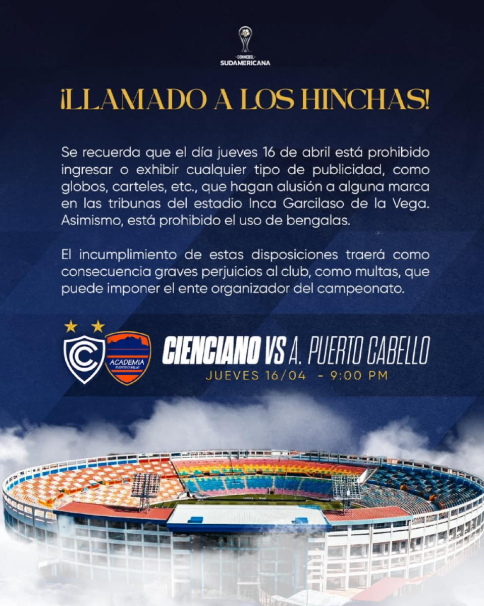Cienciano vs Academia Puerto Cabello EN VIVO HOY se enfrentarán por la segunda fecha del grupo B de la Copa Sudamericana 2026 HOY jueves 16 de abril a partir de las 9.00 p. m. (hora peruana) y 10.00 p. m. (hora venezolana) en el Inca Garcilaso de la Vega. La transmisión va por la señal EN DIRECTO de ESPN y Disney Plus.