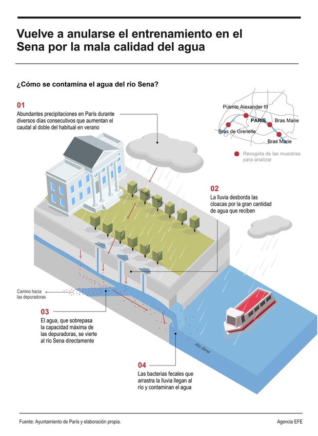 Esta decisión llega después de las intensas lluvias del viernes y sábado pasado, que empeoraron los niveles de calidad del agua y ya habían impedido realizar los entrenamientos del último domingo y lunes. Según el Ayuntamiento de París, encontraron que las bacterias fecales que arrastra la lluvia llegan al rio y contaminan el agua.