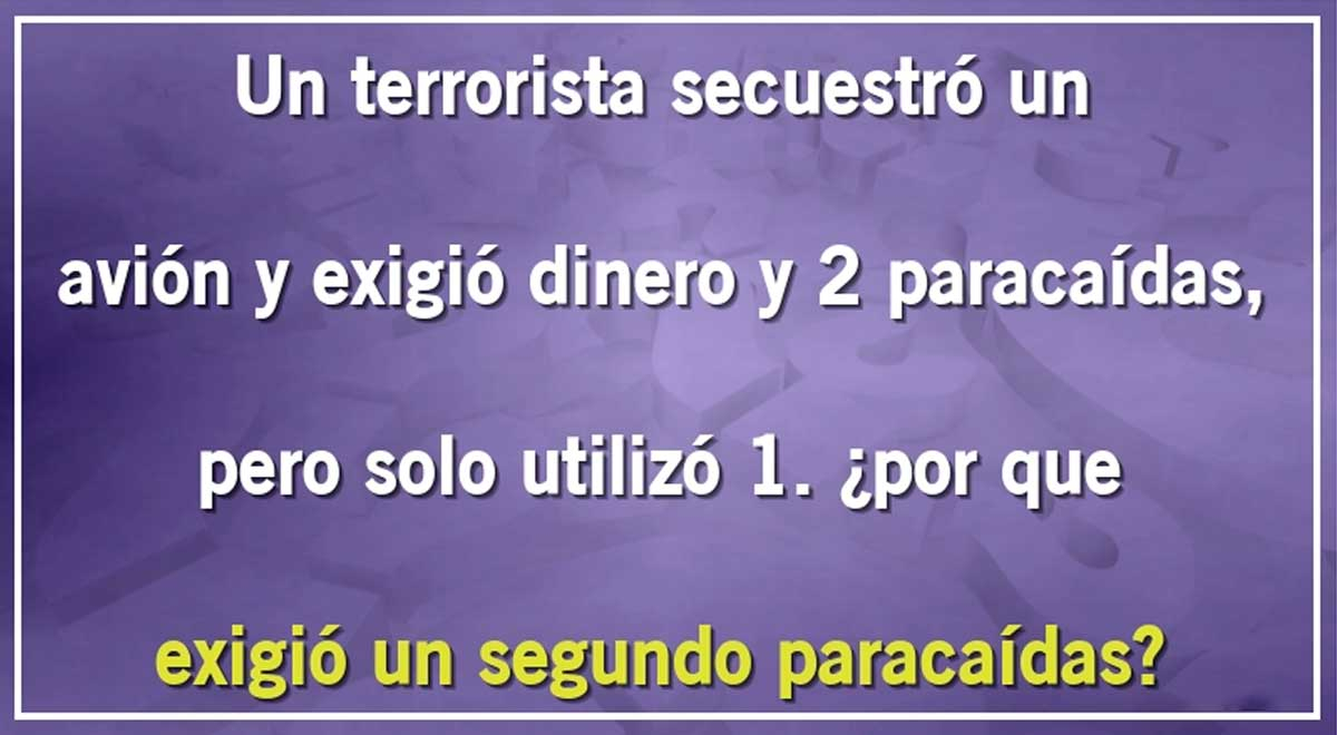 "Un terrorista secuestró un avión y exigió dinero y 2 paracaídas, pero solo utilizó 1. ¿Por qué exigió un segundo paracaídas?". Analiza cada enunciado y logra encontrar la solución del acertijo para agentes del FBI.