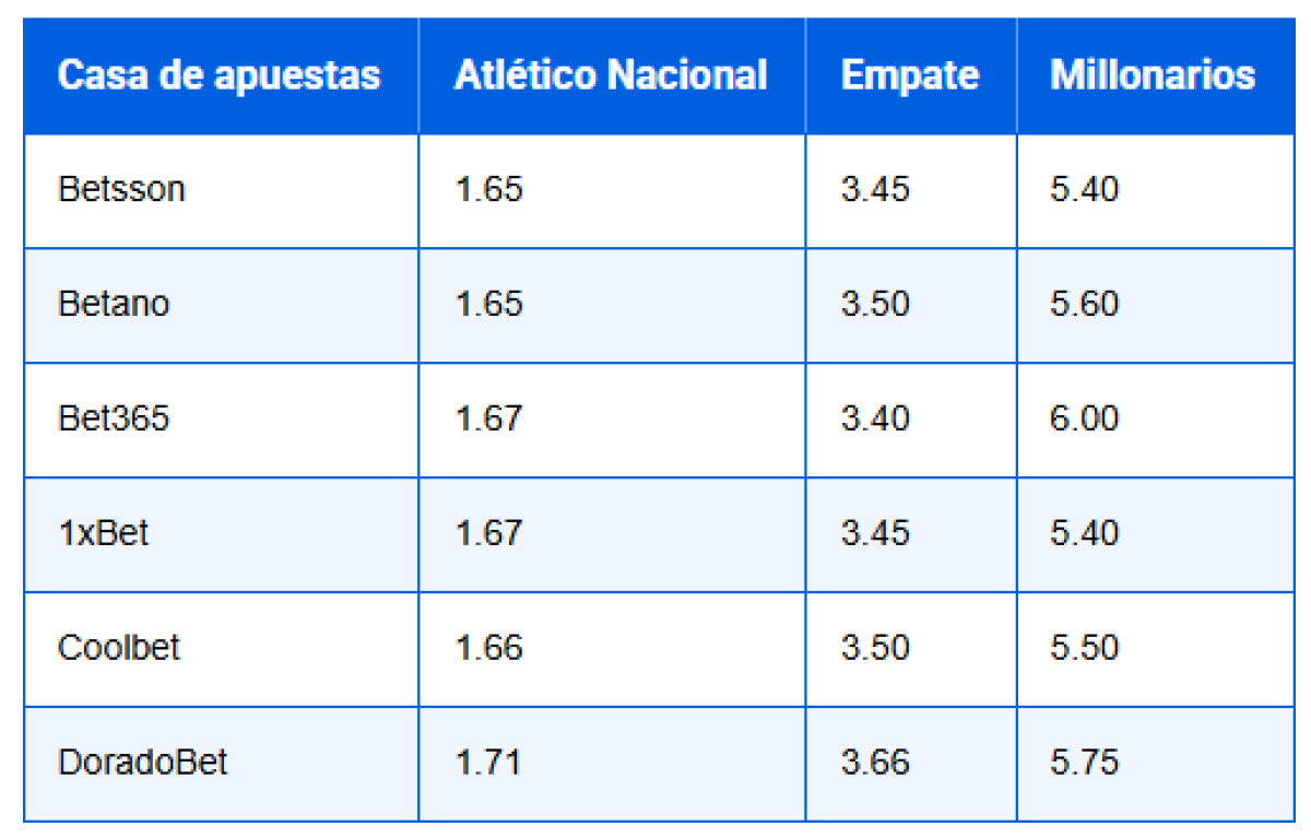 | Casa de apuestas | Atlético Nacional | Empate | Millonarios |