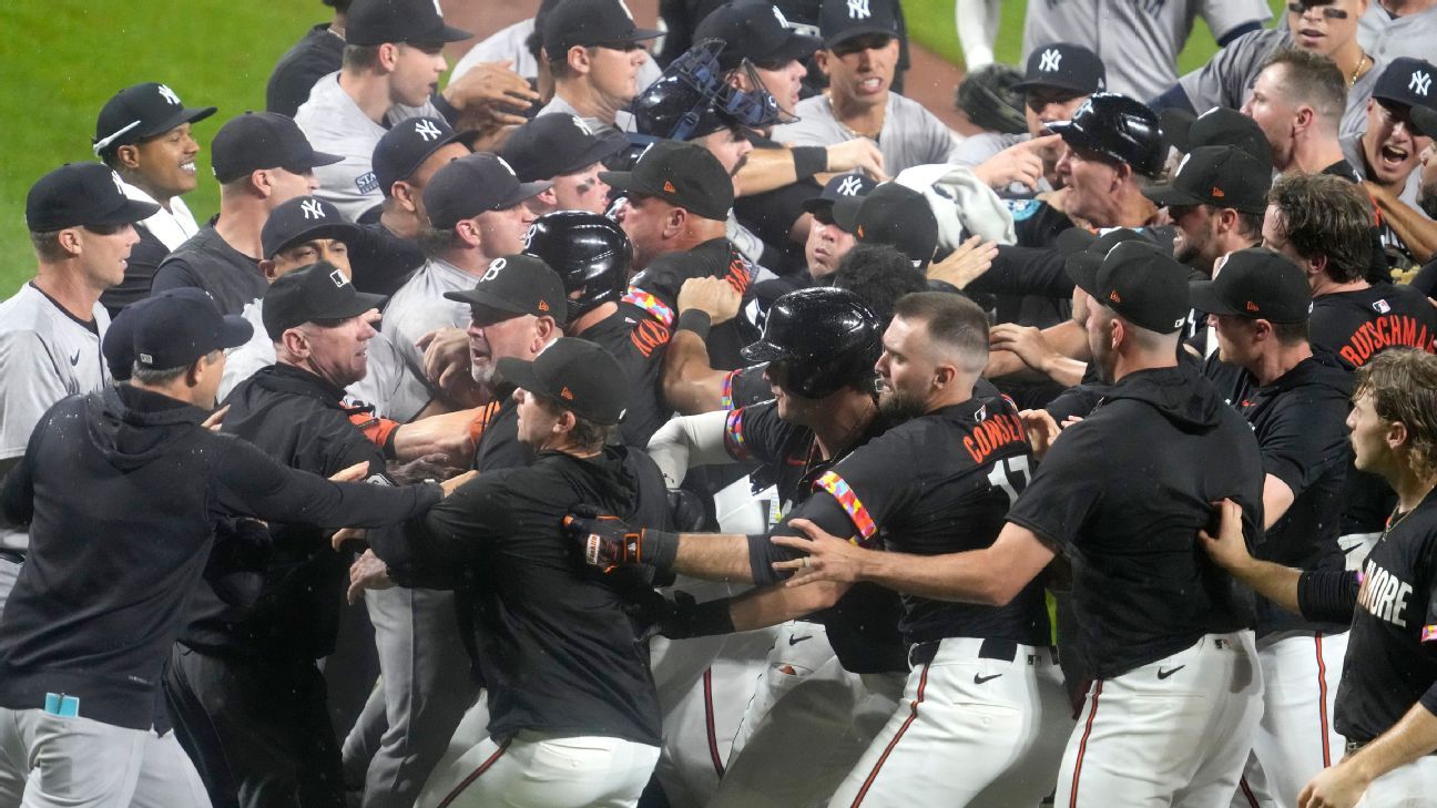 With one out, Holmes' pitch hit Kjerstad around the ear flap. After a delay, Kjerstad was able to get up but left the game. Then things escalated, with Orioles manager Brandon Hyde walking toward the New York dugout and pointing, at which point Yankees catcher Austin Wells tried to restrain Hyde but benches and bullpens emptied.