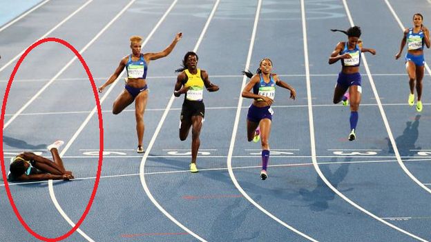 Shaunae Miller, casi en el suelo, fue la más rápida en la final de 400 metros femeninos. Su cuerpo llegó antes que Allyson Félix, a la altura del inicio de la línea blanca de 50 milímetros de anchura. Así como se ve en la foto de la llegada, las líneas verticales rojas que se utilizan para determinar el tiempo la dan como la ganadora.