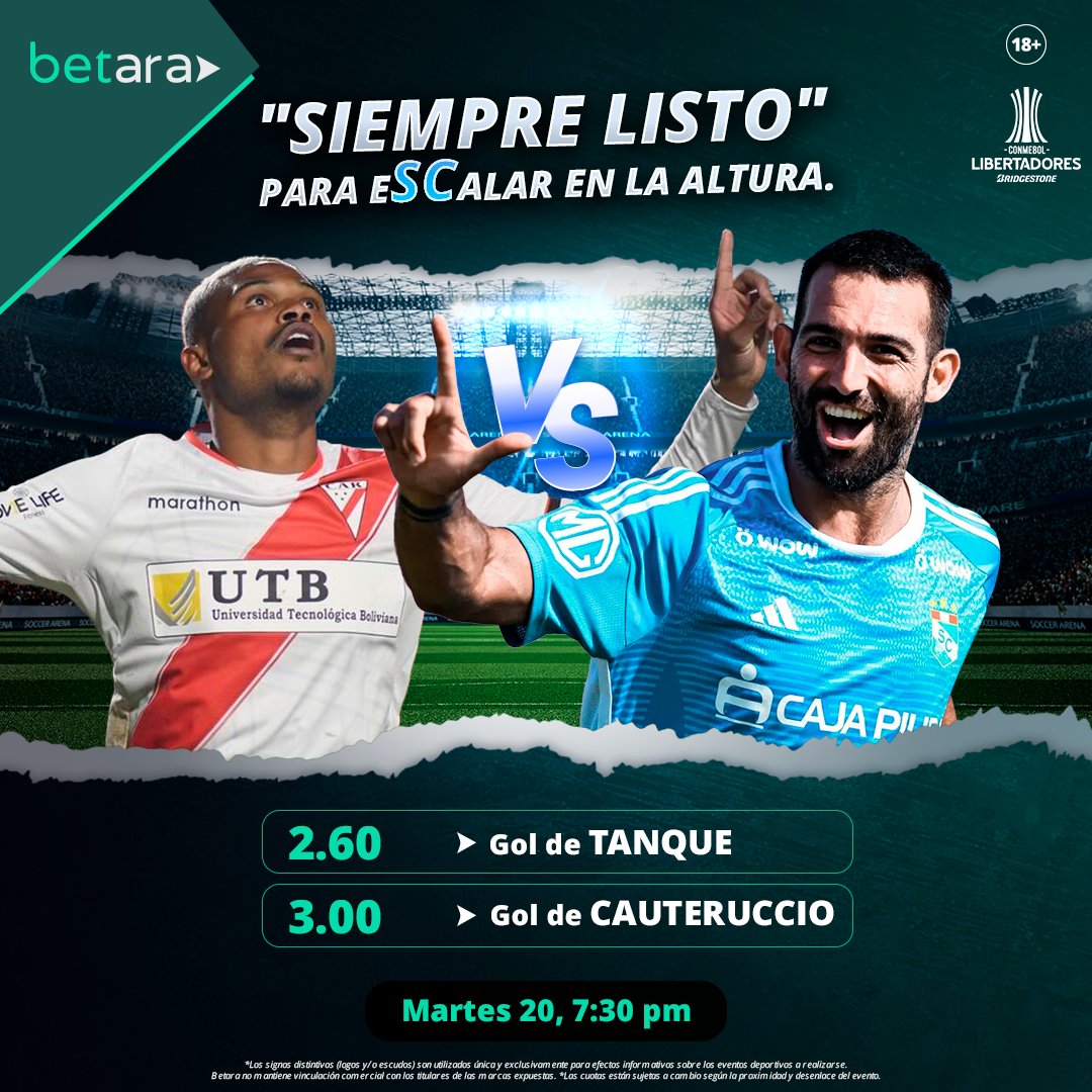 De acuerdo con la casa de apuestas Betano,Sporting Cristal saldrá al terreno de juego con un 18% de probabilidades de ganar el encuentro. Dicho resultado paga una cuota de 5.60 a través de sus SuperCuotas. Por su parte, Always Ready tiene un 60% de probabilidades llevarse el triunfo, pagando 1.65 veces lo apostado. En lo que respecta al empate, Betano da un 22% de probabilidad y paga una SuperCuota de 4.40.