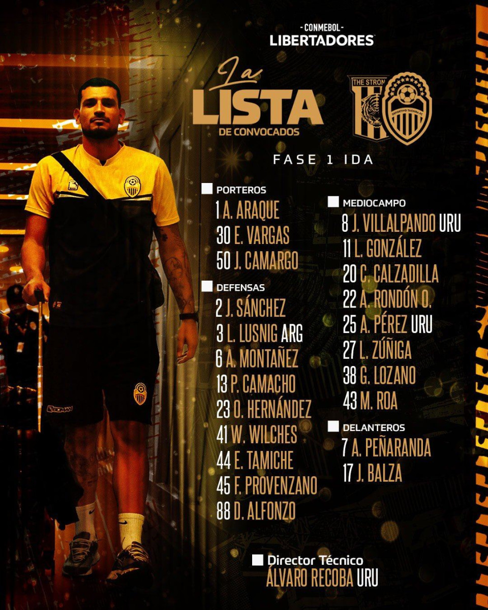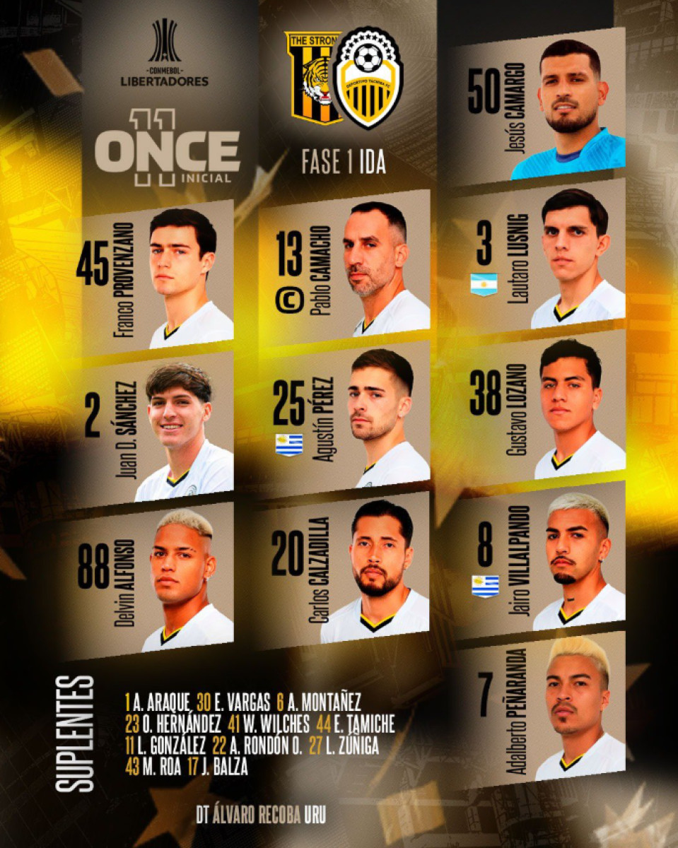 Posible alineación de Deportivo Táchira: Jesús Camargo, Franco Provenzano, Guillermo Fratta, Juan Sánchez, Lautaro Lusnig, Agustín Pérez, Gustavo Lozano, Jairo Villalpando, Carlos Sosa, Adalberto Peñaranda y José Balza.