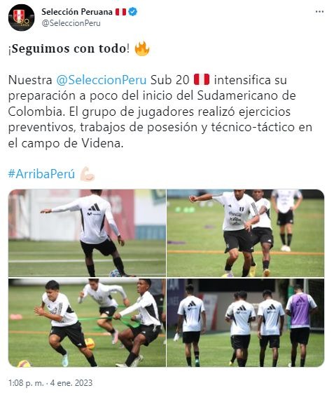 "Nuestra selección Sub-20 intensifica su preparación a poco del inicio del Sudamericano de Colombia. El grupo de jugadores realizó ejercicios preventivos, trabajos de posesión y técnico-táctico en el campo de Videna", dice el mensaje compartido por la FPF.