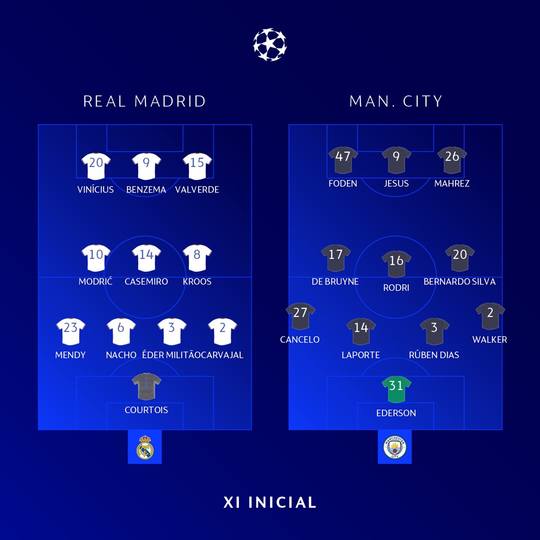 • Manchester City: Ederson; João Cancelo, Rúben Dias, Laporte, Zinchenko; De Bruyne, Rodri, Bernardo Silva; Mahrez, Gabriel Jesus, Foden.