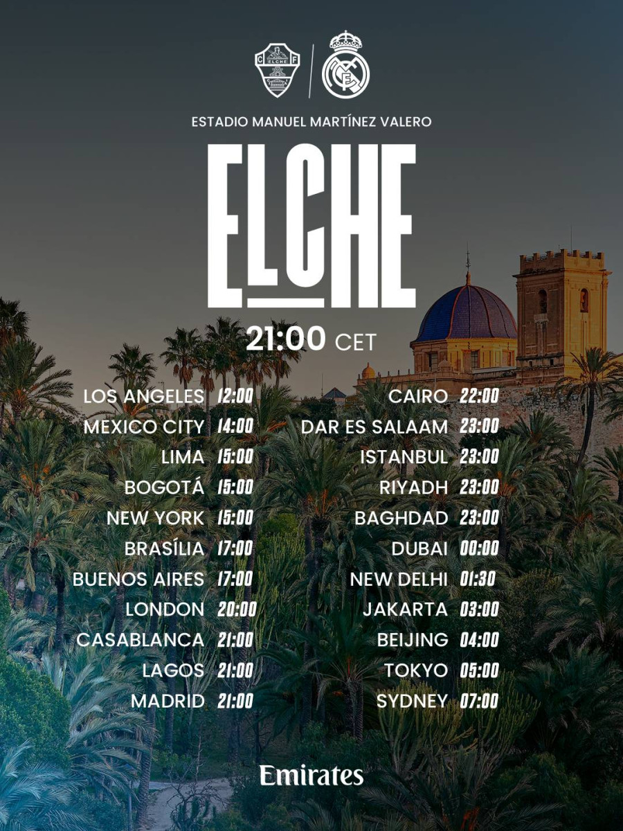 Conoce a continuación los horarios para seguir el partido de Real Madrid vs Elche desde diferentes países.