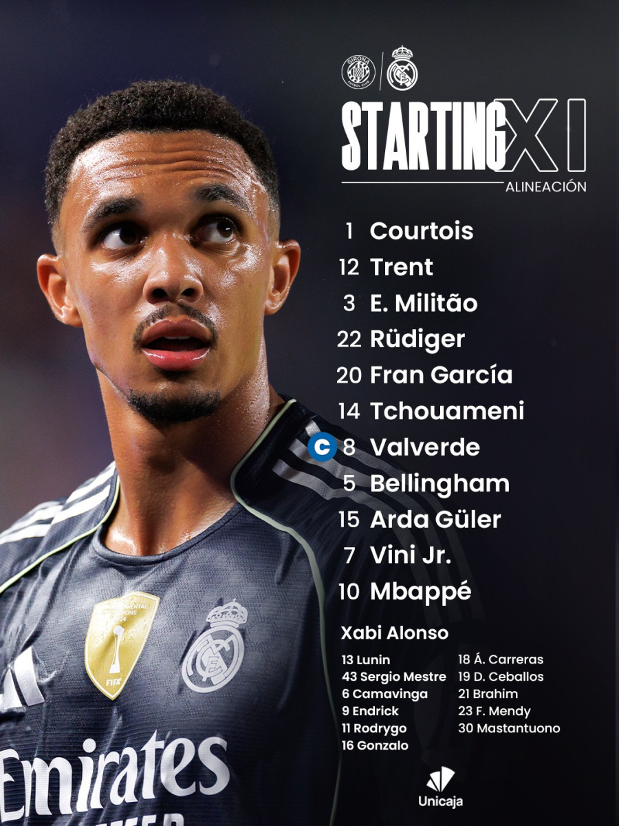 Alineación de Real Madrid: Thibaut Courtois; Trent Alexander-Arnold, Eder Militao, Antonio Rudiger, Fran García; Aurélien Tchouaméni, Federico Valverde, Jude Bellingham, Arda Güller; Vinicius Júnior y Kylian Mbappé.