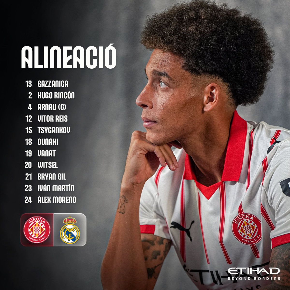 Alineación de Girona: Paulo Gazzaniga; Hugo Rincón, Arnau Martínez, Vitor Reis, Axel Moreno; Azzedine Ounahi, Vladuslav Vanat, Axel Witsel Iván Martín; Bryan Gil y Viktor Tsygankov.