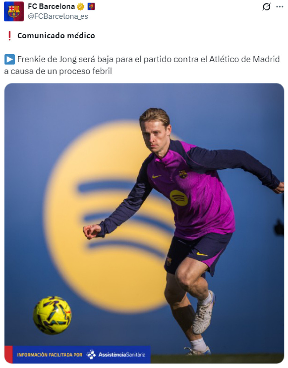 FC Barcelona confirmó que el holandés Frenkie de Jong no estará disponible para jugar ante Atlético Madrid tras "proceso febril".