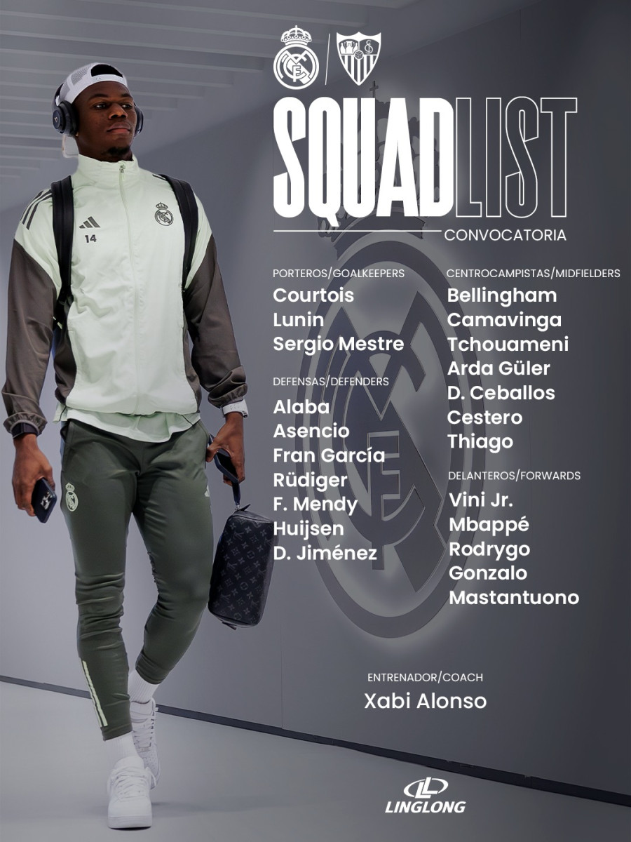 REAL MADRID: Courtois; Asencio, Huijsen, Rüdiger, Fran García; Arda Güler, Tchouaméni, Bellingham; Rodrygo, Mbappé, Vinicius