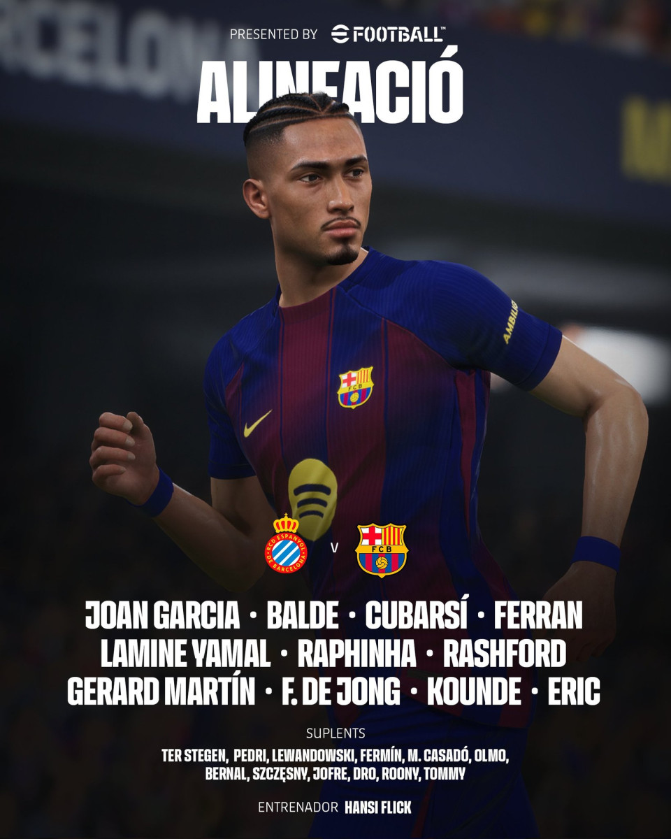 - Barcelona: Joan García; Balde, Gerard Martin, Cubarsí, Koundé; Èric Garcia, Pedri, Fermín; Raphinha, Lamine Yamal, Ferran Torres .