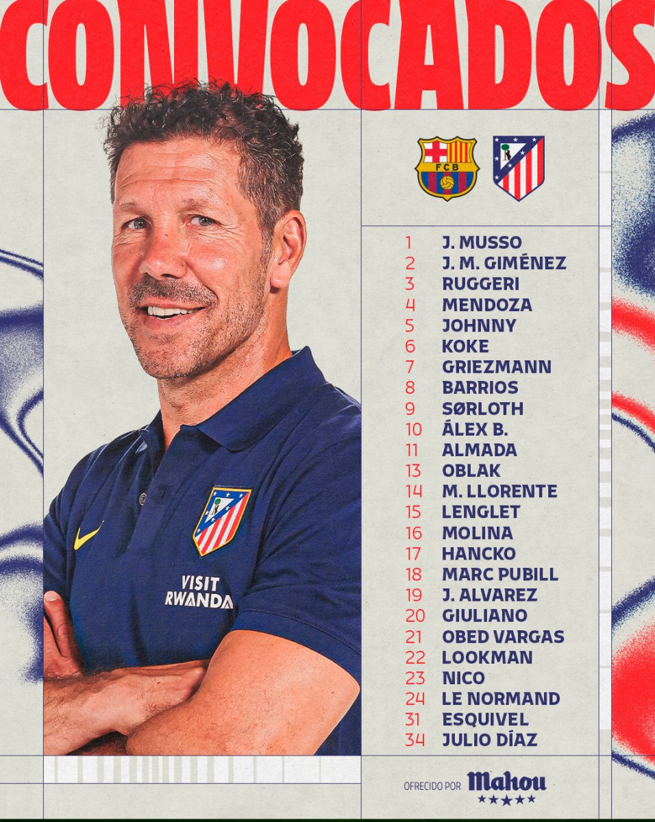 Alineación de Atlético Madrid: Musso; Marcos Llorente, Pubill, Hancko, Ruggeri; Giuliano Simeone, Cardoso, Koke, Lookman; Antoine Griezmann y Julián Álvarez.