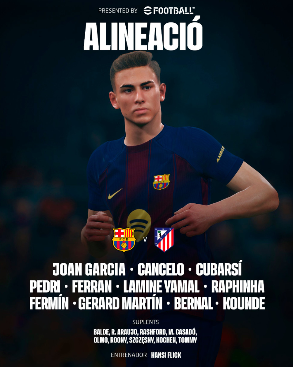 Alineación de Barcelona: Joan Garcia; Kounde, Cubarsi, Gerard Martin, Cancelo; Bernal, Pedri, Fermín López; Raphinha, Ferrán Torres y Lamine Yamal.