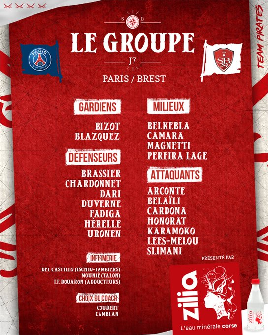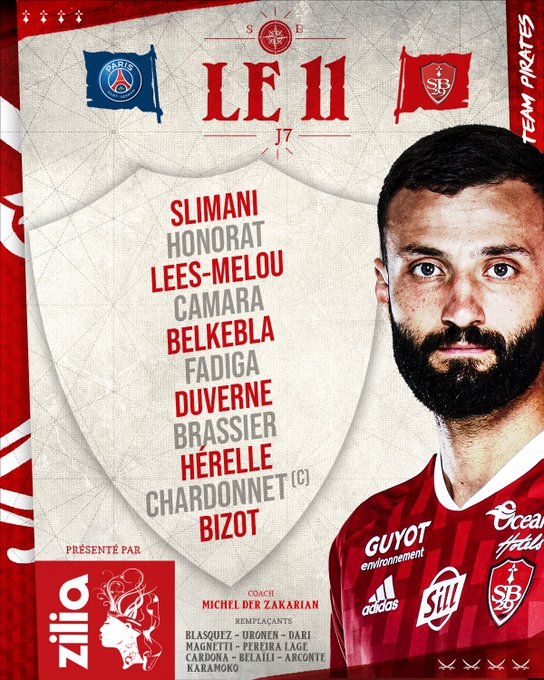Brest: Bizot; Brassier, Dari, Chardonnet, Duverne; Magnetti, Belkebla, Belaili, Lees-Melou, Honorat; Slimani.