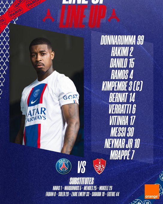 PSG: Donnarumma; Kimpembe, Marquinhos, Pereira; Bernat, Ruiz, Sanches, Hakimi; Messi; Neymar, Sarabia.