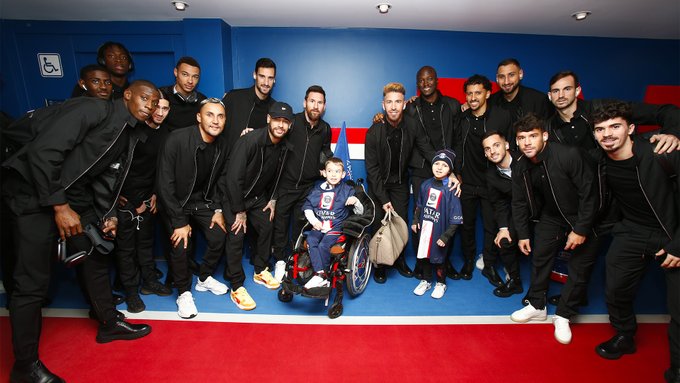 Foto de algunos jugadores de PSG con 2 pequeños fanáticos.